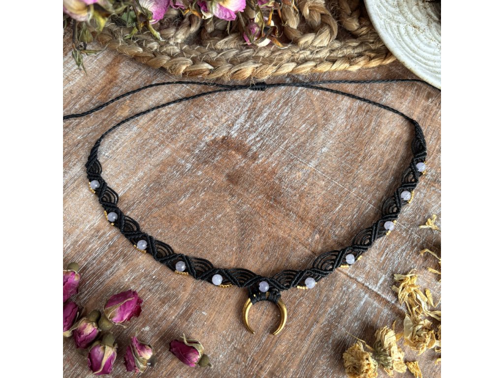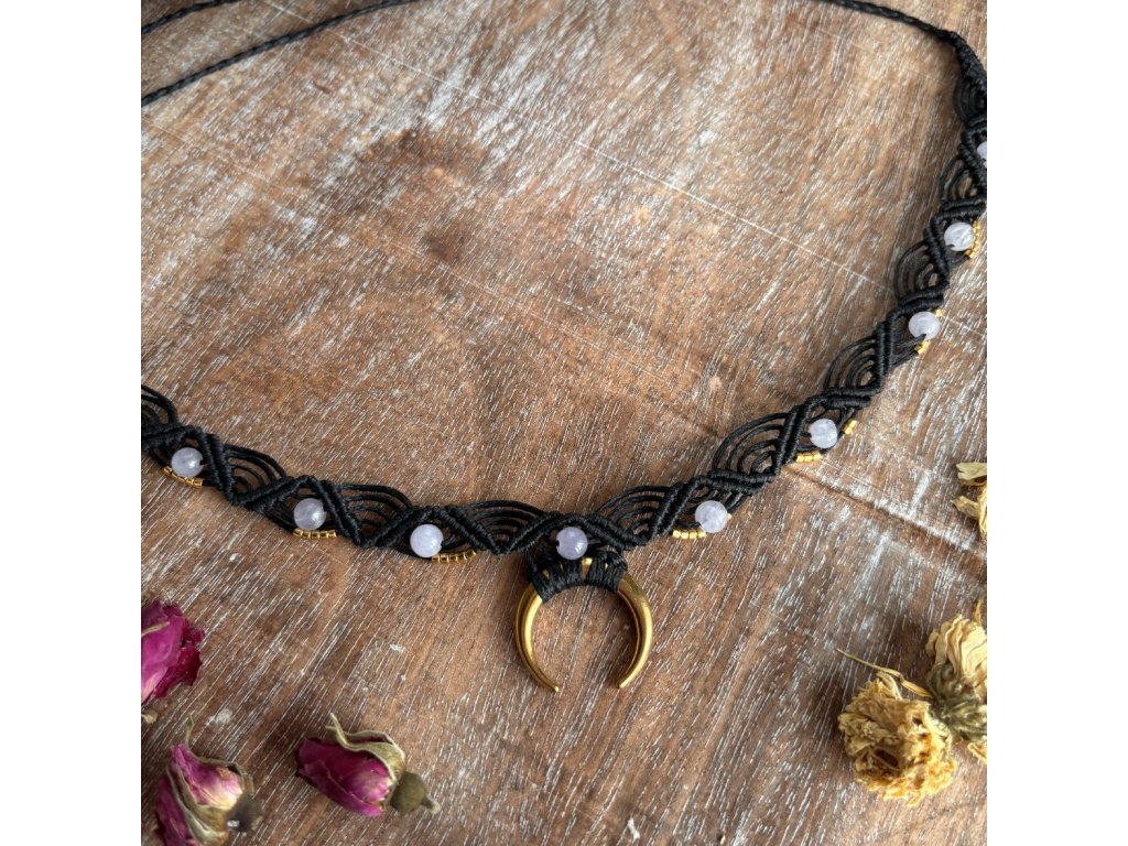 Dominantou náhrdelníku je zlatý půlměsíc, symbol proměny, intuice a vnitřní síly. Je doplněn o skleněné japonské korálky s 24kt pozlacením, které zachycují světlo jemným, teplým odleskem. Tyto detaily vytvářejí harmonii mezi tmou a světlem, mezi klidem a energií.