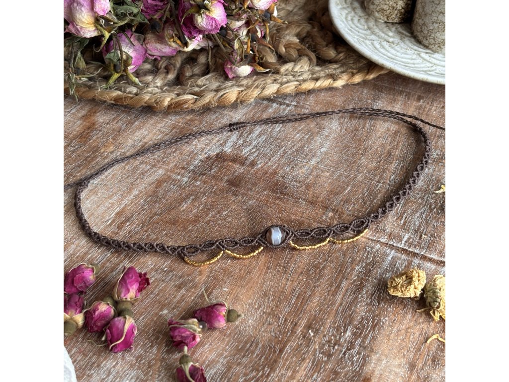 Micro macramé náhrdelník je ručně vyroben v jižních Čechách, kde každý detail vzniká pomalou a precizní ruční prací. Jemná hnědá struktura vytváří přirozený základ, který je doplněn o centrální korálek a obloukové linie zdobené drobnými zlatými detaily. Náhrdelník působí klidně, harmonicky a nese v sobě jemnou boho mystiku inspirovanou přírodou a přirozenou elegancí.