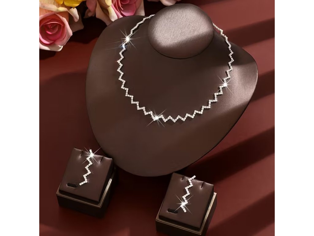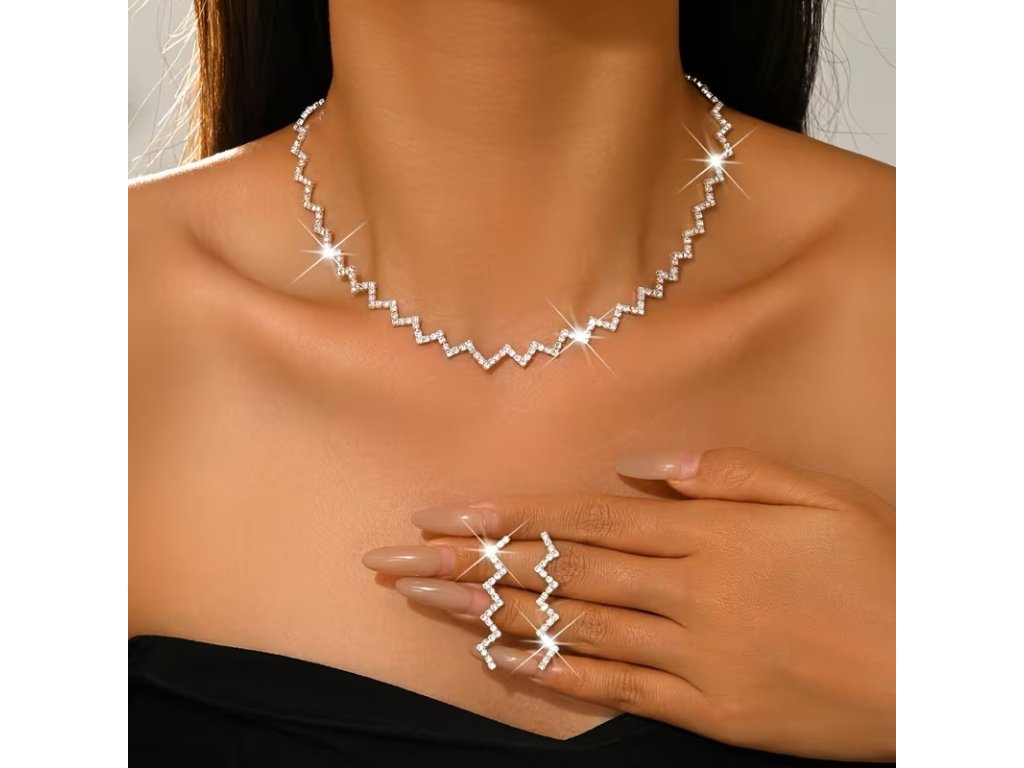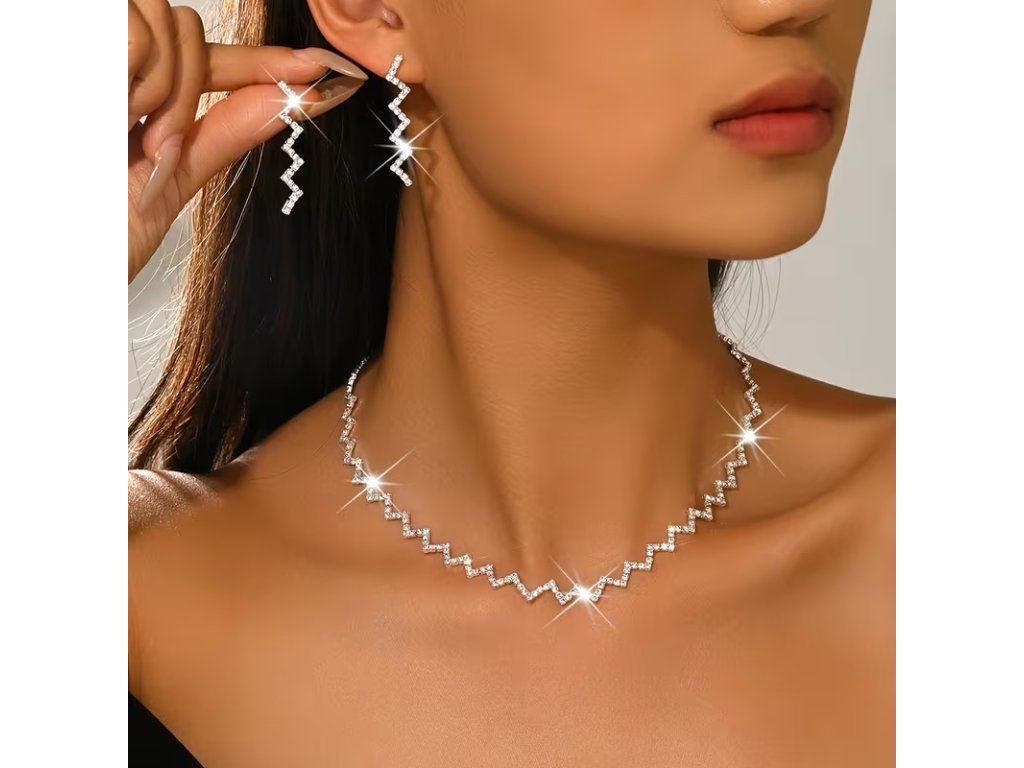 Tato moderní stříbrná štrasová souprava Sabrina složená z náhrdelníku a náušnic zaujme výrazným geometrickým cik-cak designem, který působí současně elegantně a originálně. Stříbrné provedení v kombinaci se štrasovými kameny krásně odráží světlo a dodává šperkům luxusní třpyt. Náhrdelník jemně kopíruje linii krku, zatímco náušnice zvýrazňují rysy obličeje a celý set působí výrazně, ale stále vkusně. Sada Sabrina je ideální volbou ke společenským, večerním i slavnostním šatům.