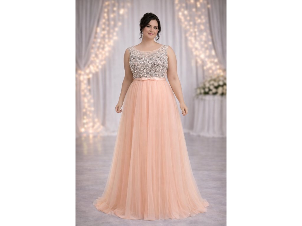 Překrásné dlouhé tylové plesové nebo společenské šaty. Ideální model na maturitní ples. Šaty jsou vytužené, zezadu na šněrování. Bohatě zdobené pajetkami a flitry. Růžové až lososové.