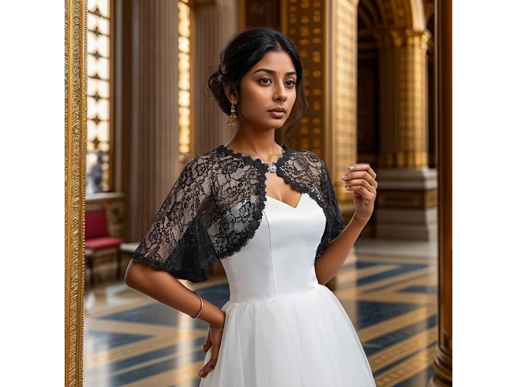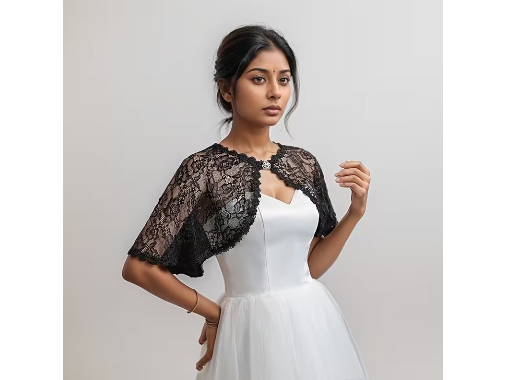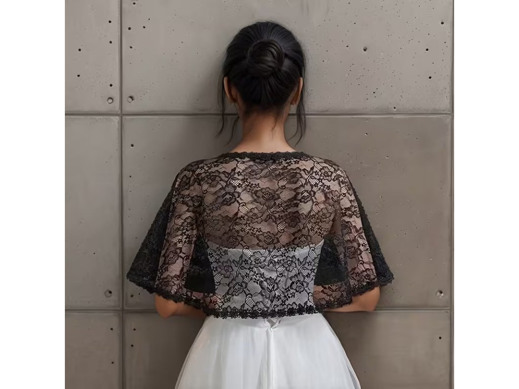 Tylové bolerko se zapínáním zdobené krajkou. Elegantní a nadčasový doplněk.