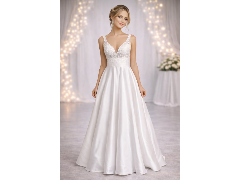 Nádherné bílé svatební šaty na široká ramínka. Šaty mají krásnou áčkovou sukni a hluboký výstřih. Tyto svatební šaty mají krásný krajkový živůtek. Šaty jsou šité na zip a jsou vyztužené. Po celé délce zadního švu jsou šaty pošité knoflíčky. Šaty jsou v čistě bílé barvě a mají nádhernou kolovou vlečku. Vhodné doplnit spodničkou ale šaty lze vzít i bez ní.