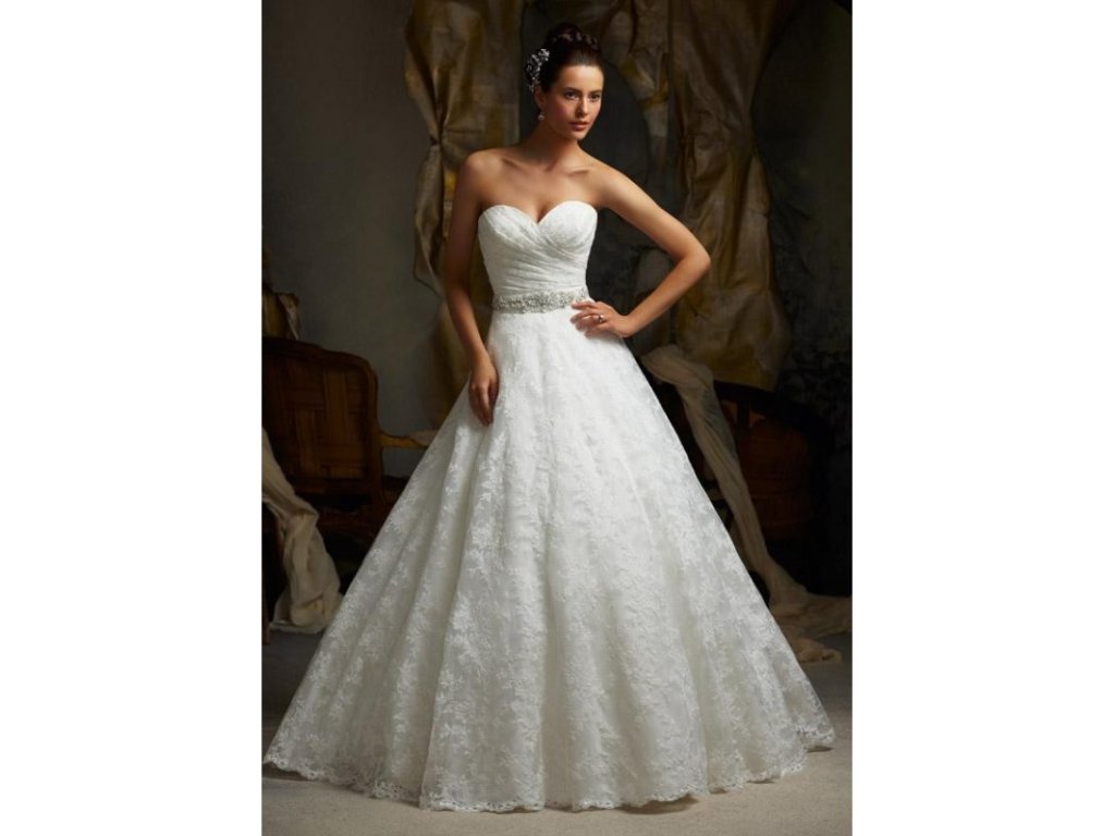 Luxusní svatební šaty krajkové v čistě bílé barvě. Šaty mají ozdobný pásek. Jsou vyztužené a zezadu na šněrování.
