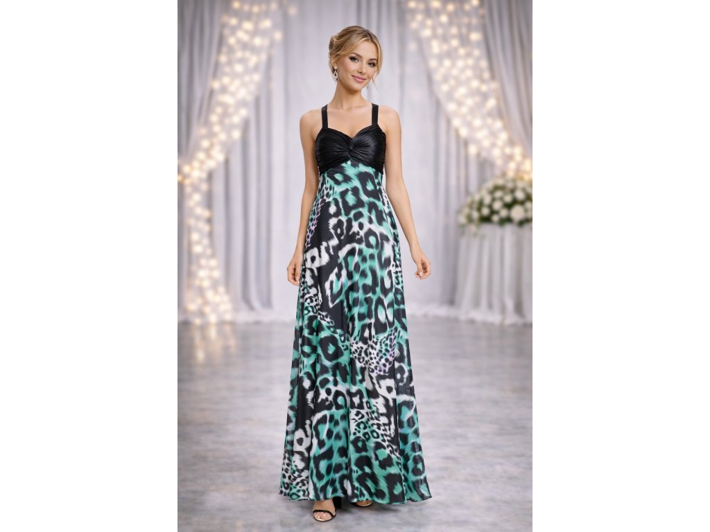 Barevné společenské šaty s tygřím vzorem. Šaty jsou šité na ramínka, jsou vyztužené a z boku na zip.
