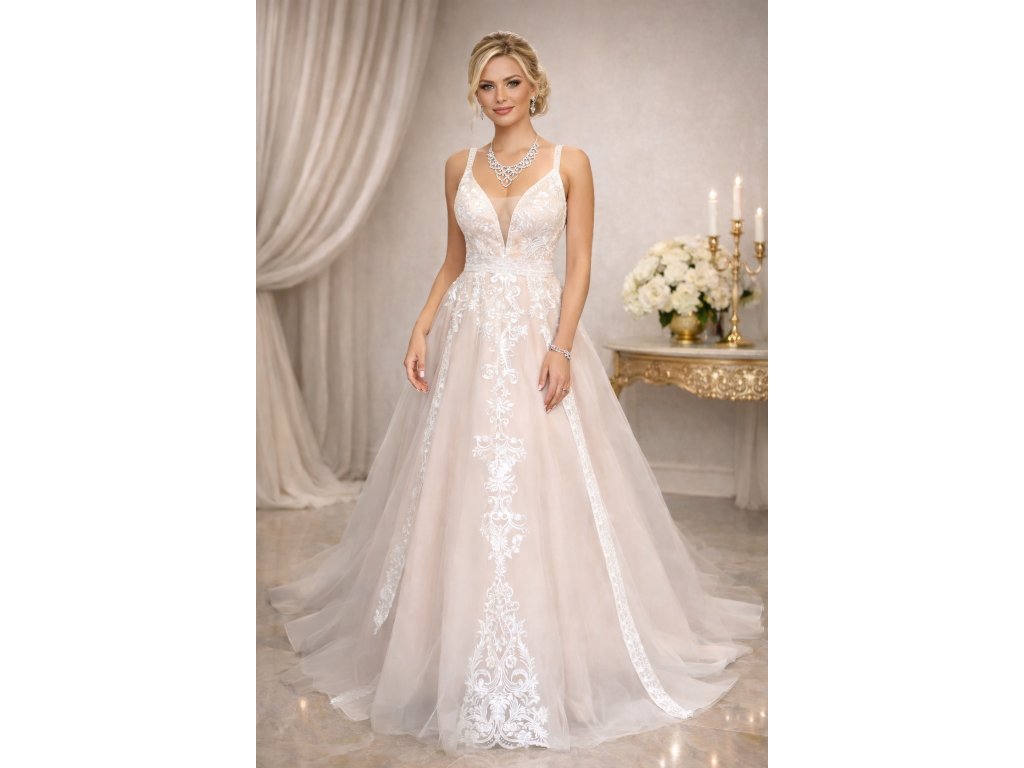 Krásné světle růžové svatební šaty Evita. Šaty jsou vyztužené a zezadu šité na zip. V módní světle růžové barvě. Šaty mají tenká špagetová ramínka, áčkovou sukni a véčkový výstřih. Vhodné doplnit áčkovou spodničkou.